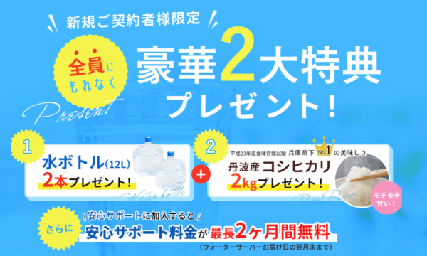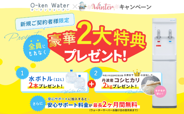 オーケンウォーターでは、時期によってさまざまなキャンペーンを実施しています。新規契約時のキャッシュバックや、初回ボトル無料プレゼントなどが代表的です。