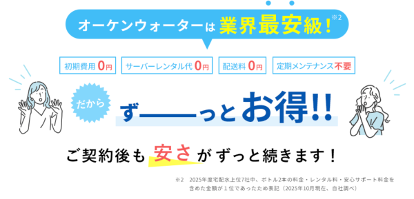 オーケンウォーターの大きなメリットの一つは、初期費用が一切かからないことです。入会金、サーバー設置費用、初回配送料などはすべて無料です。契約したその日から、水代のみで利用を始められます。