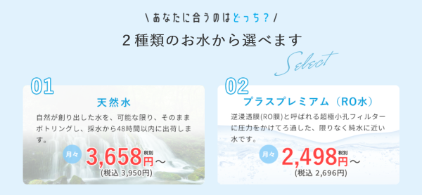 料金面では、両社ともほぼ同水準です。水の単価やレンタル代、配送料などを総合的に見ると、大きな差はありません。最終的には、採水地選択の自由度を取るか、デザイン性を取るかという判断になるでしょう。
