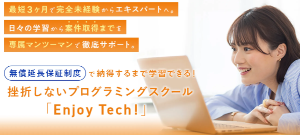 エンジョイテックはオンライン主体で学べるプログラミングスクールです。