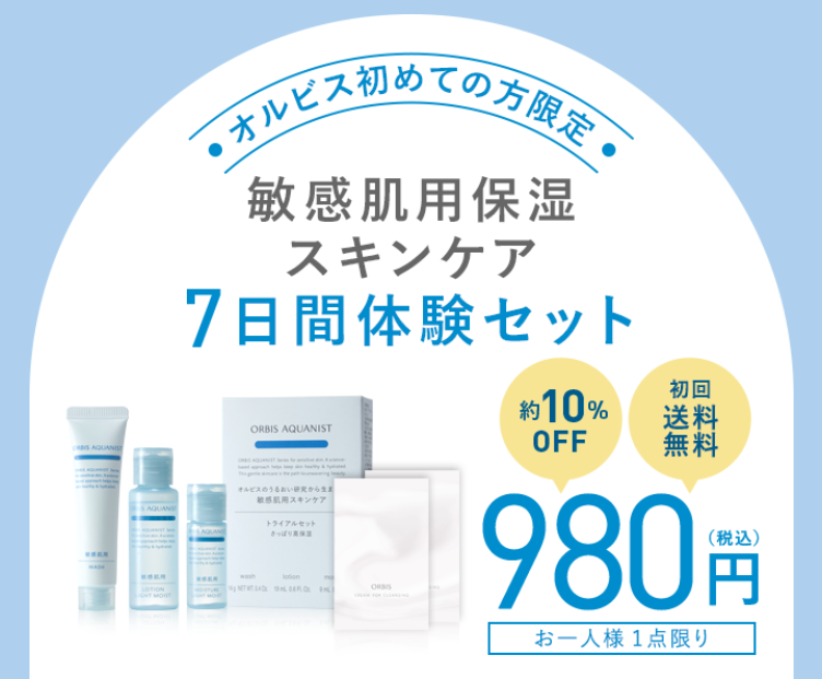 特に初めて使うスキンケア製品は、自分の肌に合うかどうかが一番の懸念点ですよね。そこで推奨したいのが、公式サイト限定の「敏感肌用保湿スキンケア7日間体験セット」です。このセットなら、アクアニストのライン使いを980円(税込)・送料無料という破格のプライスでじっくりお試しいただけます。