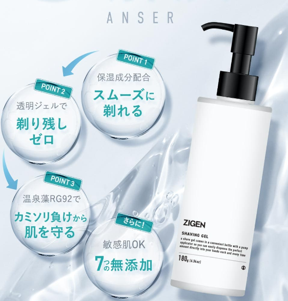 ZIGENシェービングジェルは、泡立てないジェルタイプのシェービング剤です。